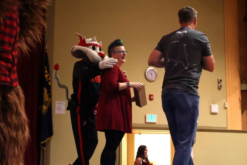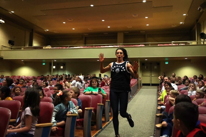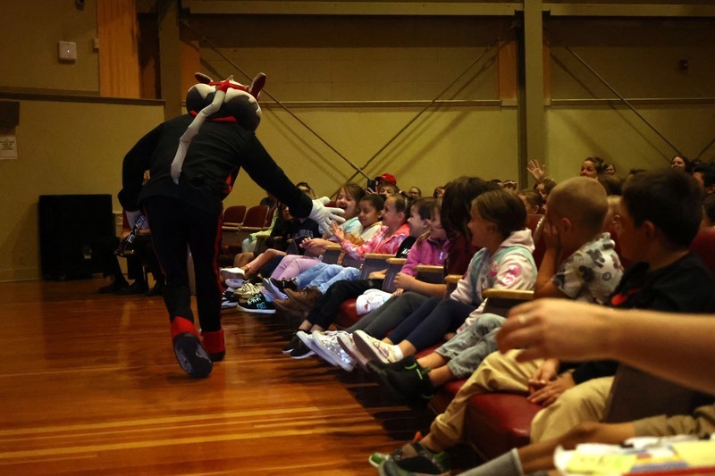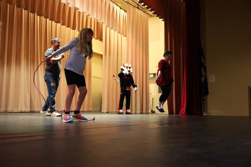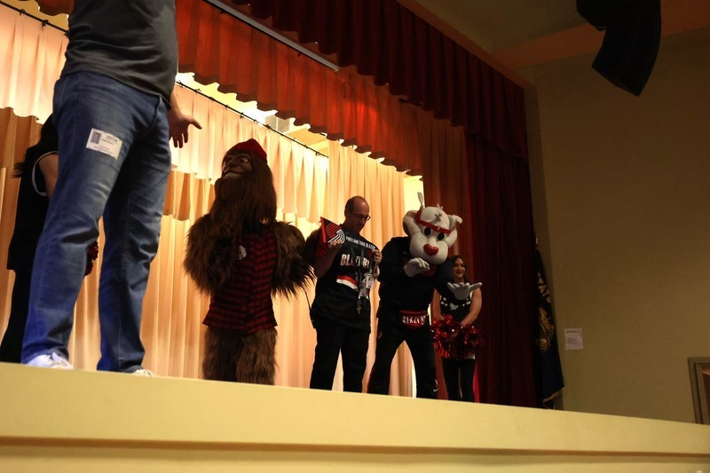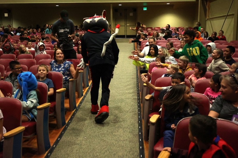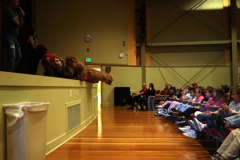 Blaze, Douglas Fur and members of the BlazerDancers took part in an assembly to start the day at Mills where several students and teachers participated in an exercise through the Mills Auditorium.