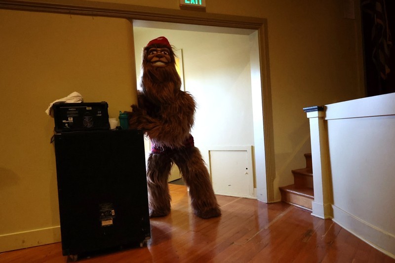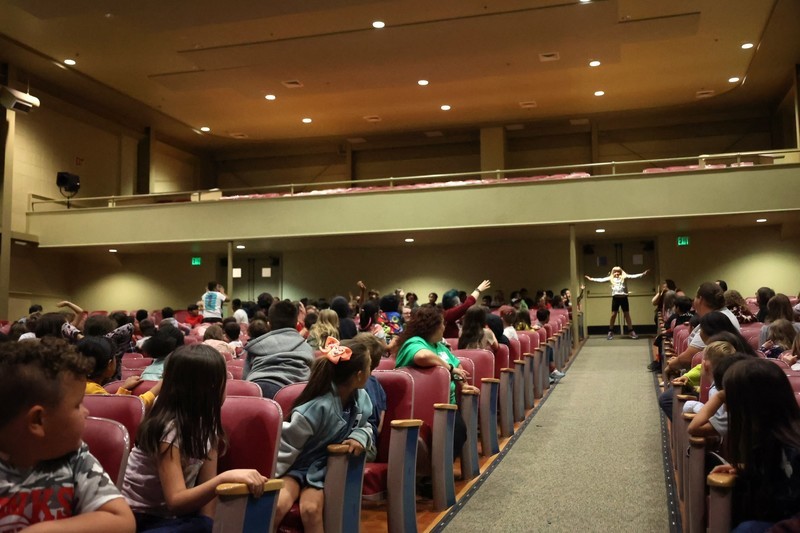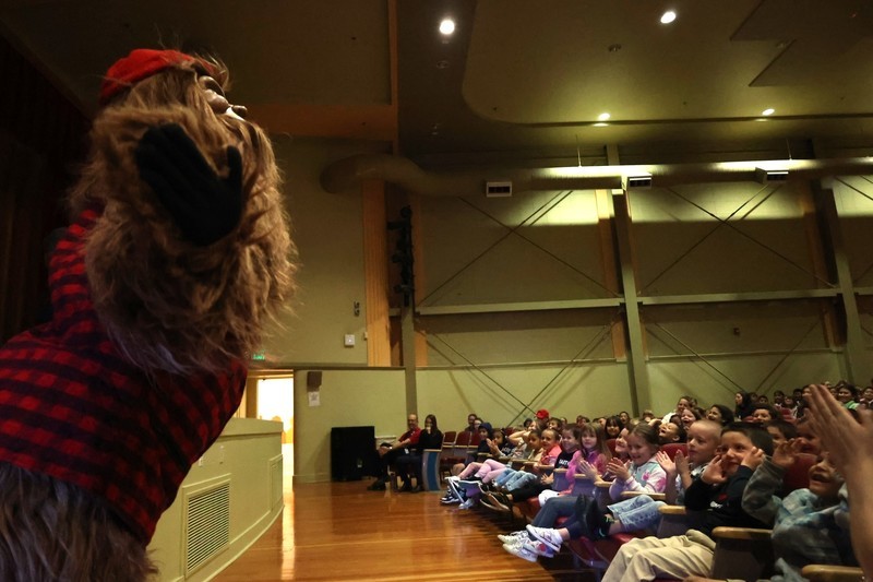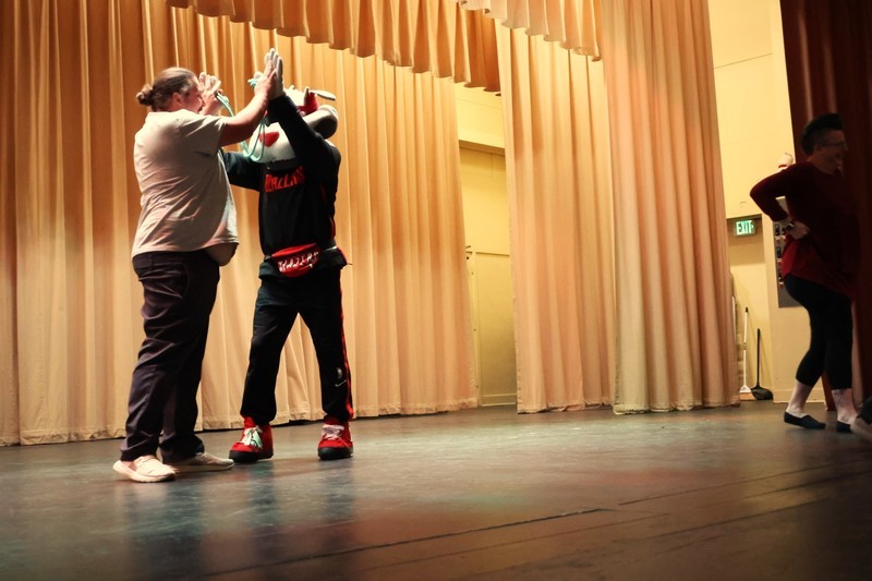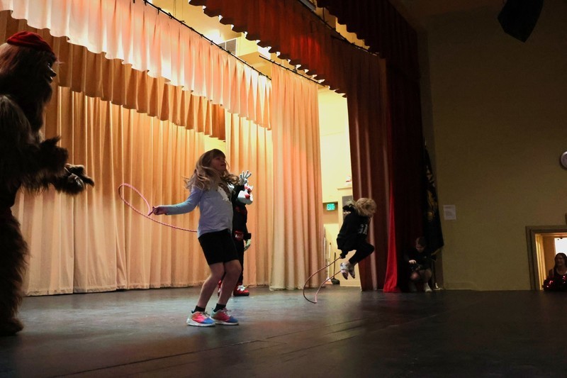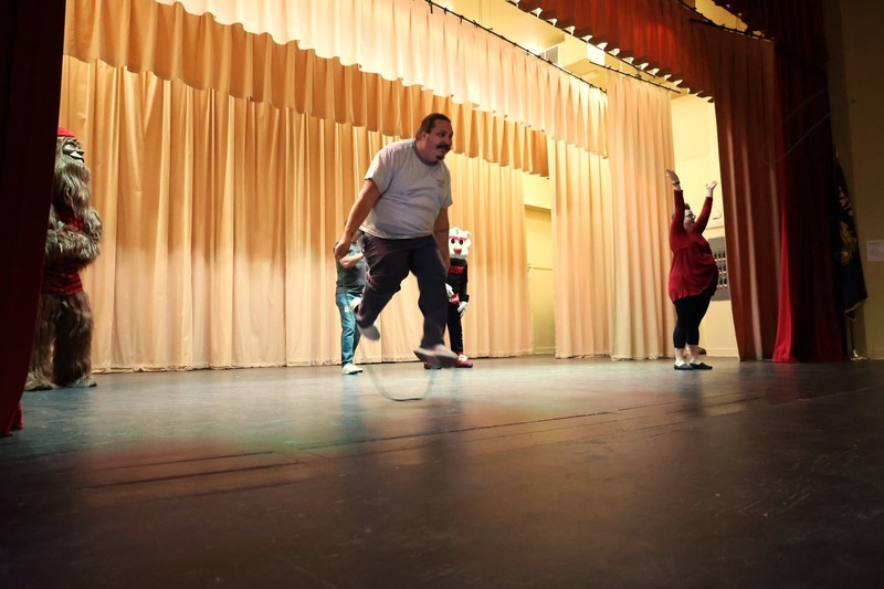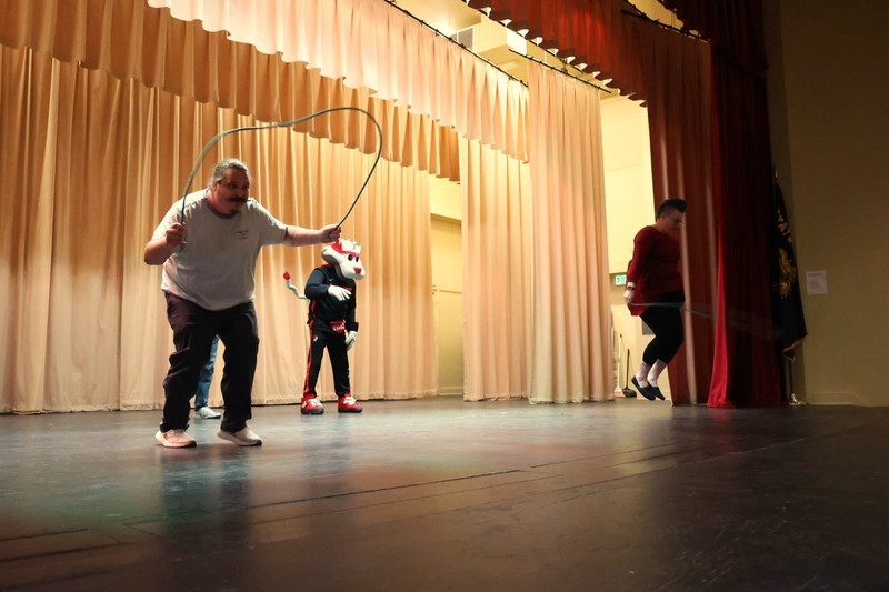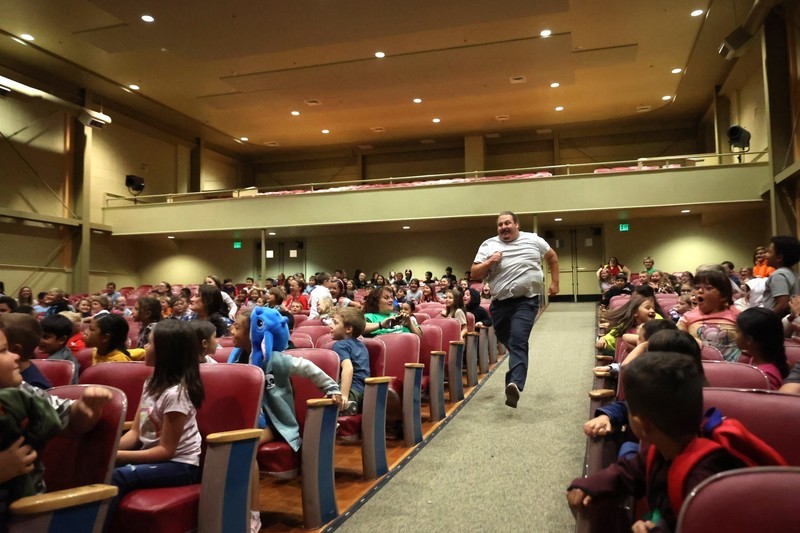 Blaze, Douglas Fur and members of the BlazerDancers took part in an assembly to start the day at Mills where several students and teachers participated in an exercise through the Mills Auditorium.