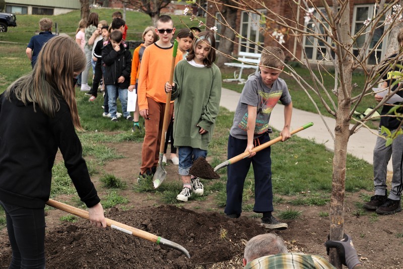 The fifth and fourth grade students were urged by their teachers to help the younger students at Roosevelt understand their new Yoshino Cherry tree should be well maintained.